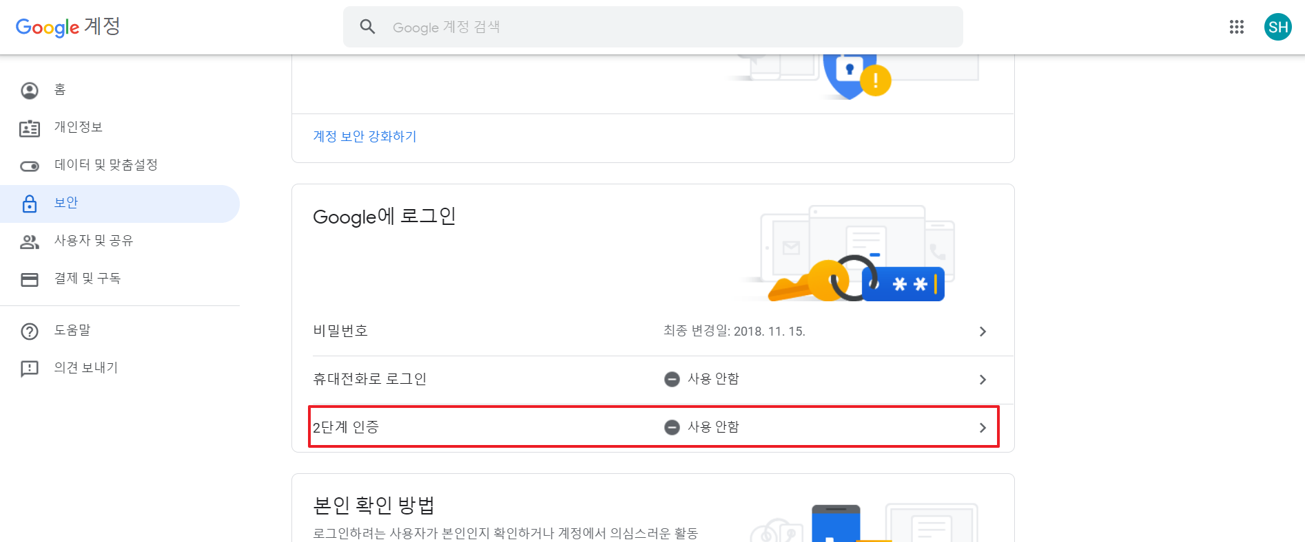 핸드폰 인증이 끝나면 위와 같이 2단계 인증을 사용할 수 있게 된다.