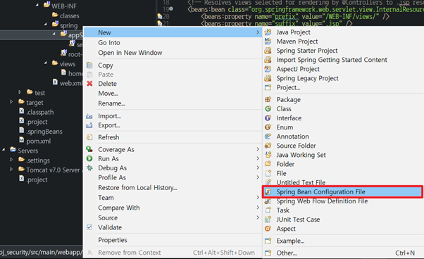 [WEB-INF]-[spring]-[appServlet] 에서 오른쪽 클릭 후 New에 Spring Bean Configuration File을 클릭한다.