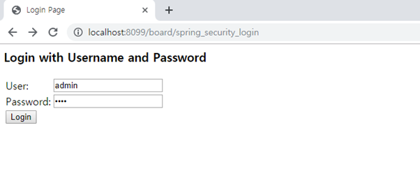 아주 간단한 스프링 시큐리티 설정이 끝났습니다. 다시 localhost:8099/board URL을 호출해보자.