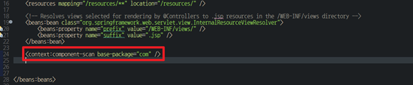 1장에서 스프링 프레임워크를 설정함에 따라 @Controller, @Service, @repository 등의 어노테이션을 선언하여 사용한다. 여기서 base-package 옵션은 패키지를 어디서부터 스캔할지 지정한다. 따라서 최상위 경로를 지정해주면 해당 경로를 포함한 모든 하위 경로에 적용되고, 어노테이션을 명시한 자바 파일들이 빈으로 등록되어 사용 가능해진다.