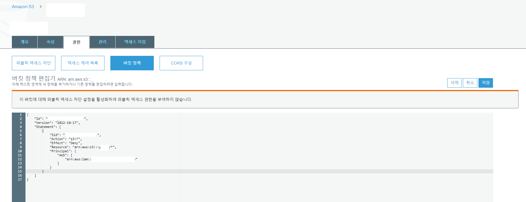 2) 메뉴 중 권한 탭을 클릭하면 버킷 정책이 보인다.