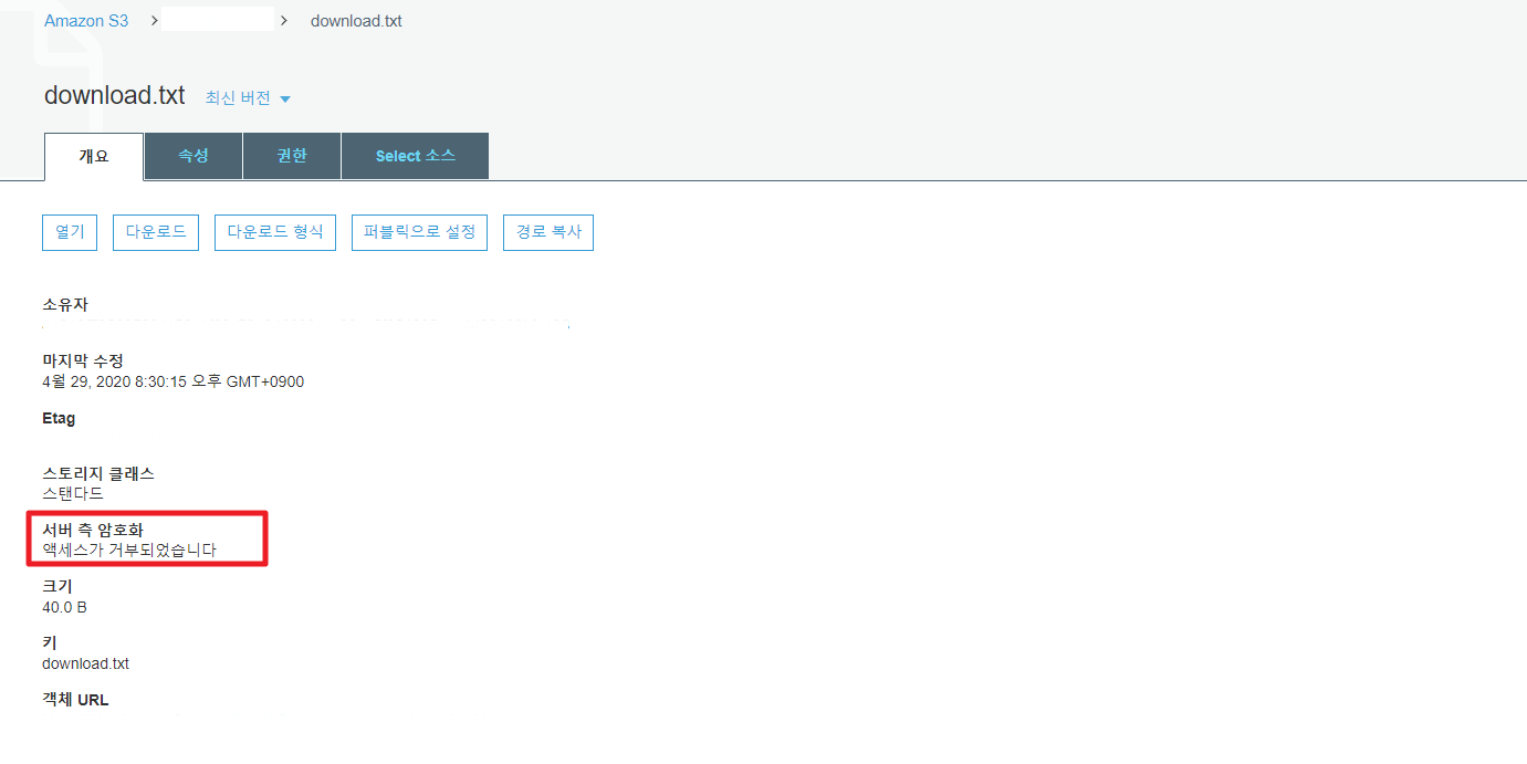 7) 이제 해당 IAM계정으로 로그인 후 버킷에 접근해보면 버킷내 모든 파일에 대한 액세스 접근 제한을 확인할 수 있다.