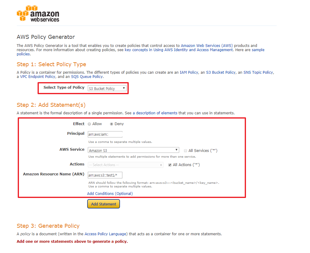 5) 모든 입력을 마친 후 아래 Add Statement - Generate Policy를 클릭한다.