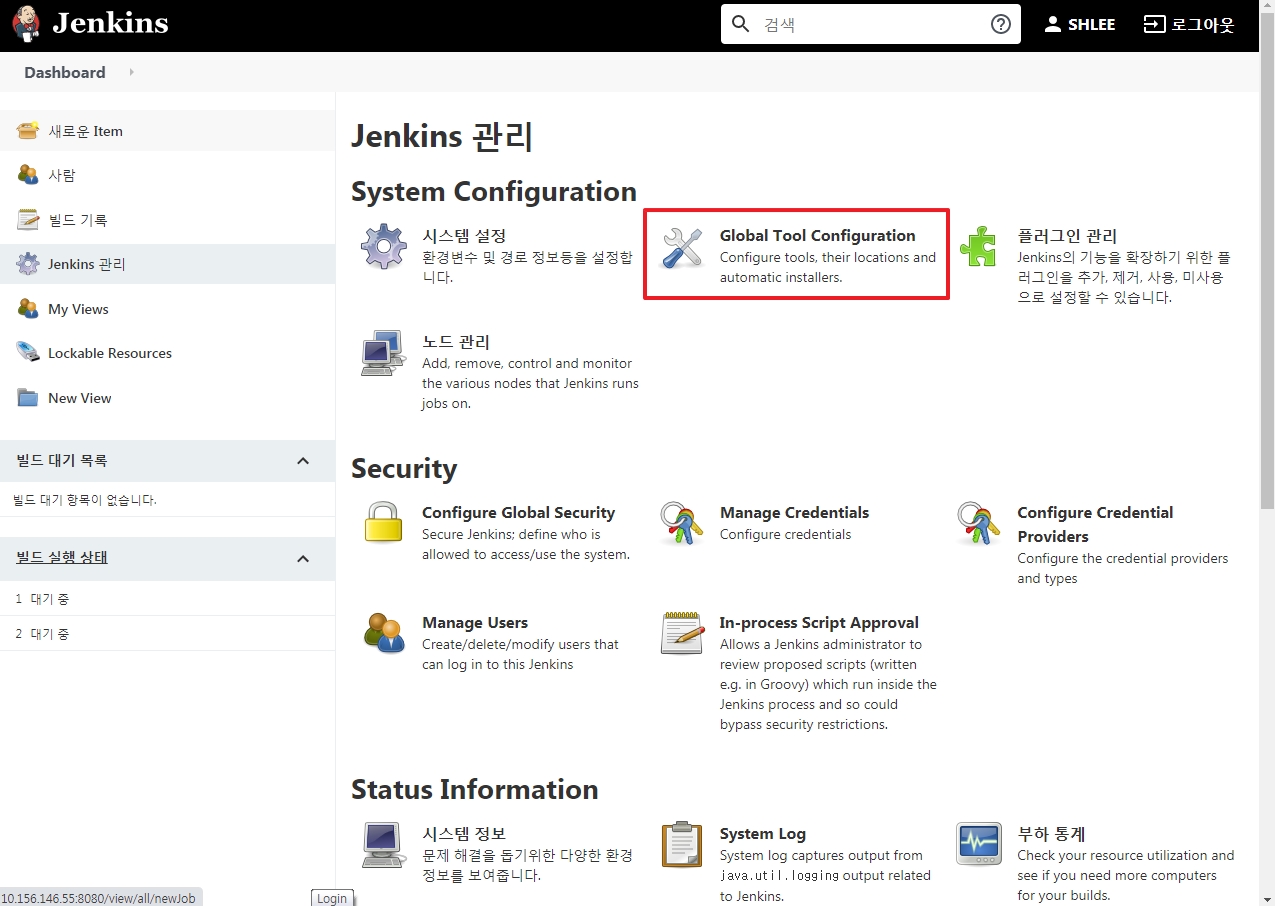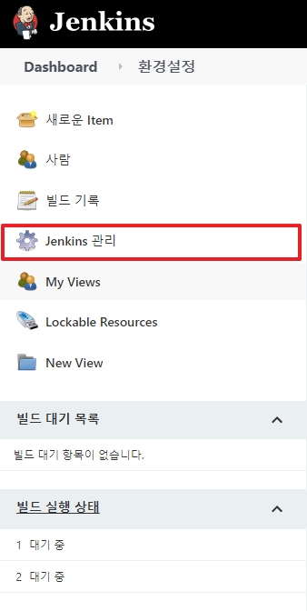 10) 이제 GitHub와 연결하기 위한 몇 가지 설정을 시작한다. 메뉴 중 Jenkins 관리를 클릭한다.