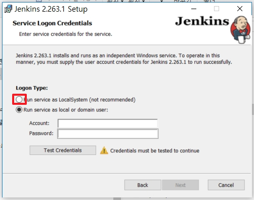 2) Logon Type : Run service as LocalSystem을 체크하고 넘어간다.