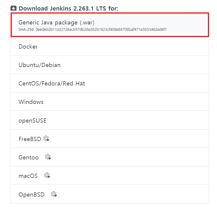 www.jenkins.io/download/ 사이트에 접속해 아래 war 파일을 다운받는다.