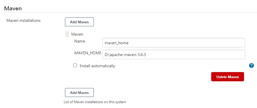 12-3) 맨 하단에도 Maven 설정이 있다. Add Maven 클릭 후 name에는 적당한 이름과 MAVEN_HOME에는 maven 폴더명까지만 경로를 입력해준다.