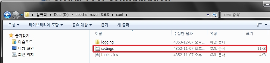 12-2) Maven Configuration에 아래와 같이 옵션 선택 후 다운받은 maven 파일의 settings.xml이 있는 경로를 입력한다.