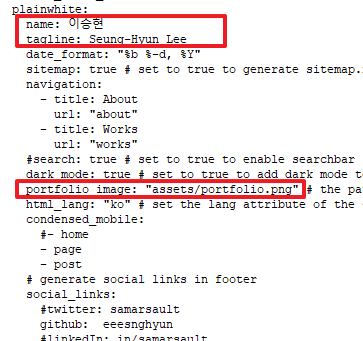 _config.yml 소스를 보니 아래와 같이 plainwhite 내에 name, tagline, portfolio image라는 값들을 확인할 수 있었다. 아마 이 문서에 정의된 변수들은 Map 형태의 키(Key)와 값(Value)으로 이해하면 되지 않을까 싶다.