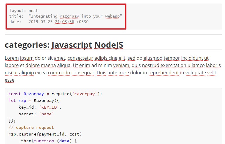 이 소스는 해당 파일이 _layouts - default.html에 있는 {{ content }} 영역에 삽입된다는 의미이다. 이 형식은 YAML Front matter 형식으로 작성된 선언부로서 Jekyll에서 포스트나 페이지를 관리하는데 사용하는 YAML 방식의 문서 양식이라고 한다. 예를 들어, page.html 상단부에 위와 같은 형식이 사용된다면 page.html의 내용이 default.html에 있는{{content}}영역에 삽입되어 보여지게 된다.