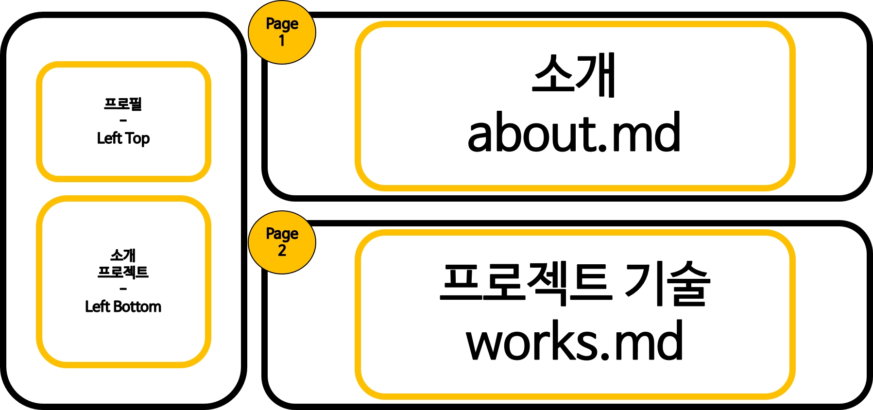 또 나를 소개하는 페이지(about.md)와 프로젝트 리스트 페이지(works.md)를 만들기로 했다. 이 구조는 기존 구조와 같이 왼쪽에 프로필 페이지를 그대로 두고 오른쪽 페이지만 변경되는 구조로 만들 예정이다.