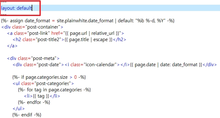 post.html은 default.html 레이아웃을 사용하고 있다. 기존 default.html 파일은 그대로 두고 복사를 해서 원하는 구조로 변경하기로 했다.