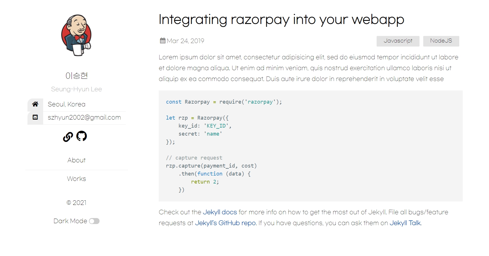 사용된 테마는 아래와 같은 구조로 되어 있었다. 왼쪽을 기준으로 고정시킨 다음, 오른쪽 페이지에 컨텐츠를 띄우는 방식이다. (포스팅 글 클릭시 왼쪽 프로필 페이지는 그대로 유지)
