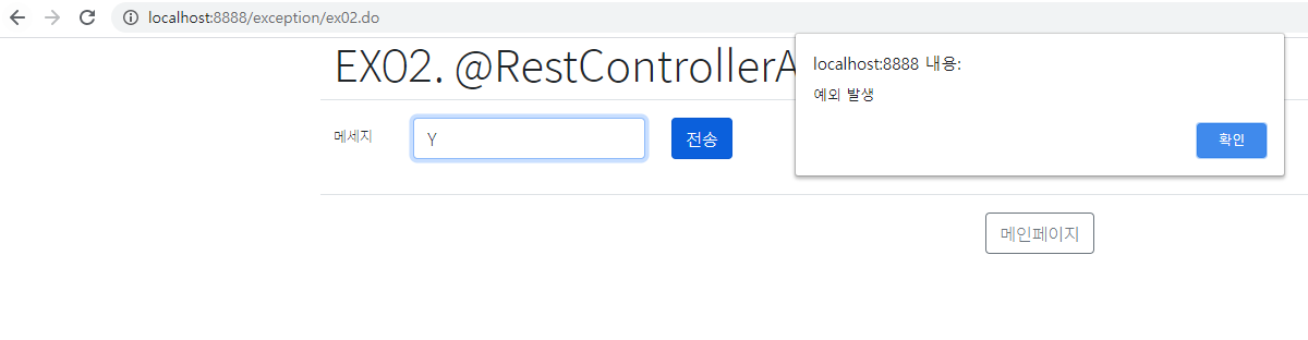 테스트 페이지를 하나 만들고 Y 입력시에 예외가 발생하도록 했다.