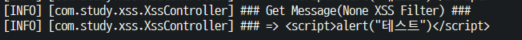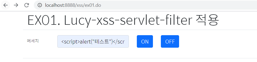 ex01.jsp에서 스크립트 작성된 문자열을 서버로 전송하도록 해봤다. ON 버튼은 필터를 사용하도록 하고 OFF 버튼은 필터 사용하지 않도록 했다.(lucy-xss-servlet-filter-rule.xml 48~50라인 참고)
