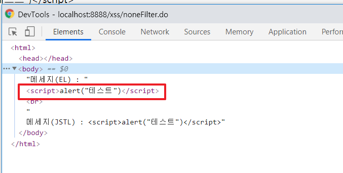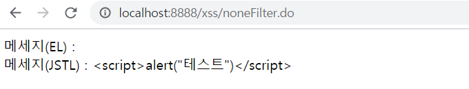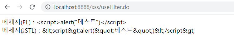 el 태그로 사용한 경우 스크립트 문자가 그대로 출력된다.(스크립트가 실행은 되지 않았지만) 반면 jstl 태그를 사용한 경우 치환된 문자열이 출력된다.