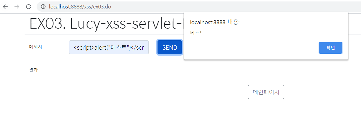message 페이지로 이동하자 스크립트가 작동했다. 아마도 el 태그에서 스크립트가 작동됐을 것이다. jstl 태그는 문자열로 적혀있을 뿐 스크립트가 실행되지 않는다. 이것은 jstl의 escapeXml 속성 때문이다. escapeXml은 HTML 태그를 text로 적용시킨다. 그래서 el 태그를 쓸 때는 XSS 취약점을 조심해야 한다.