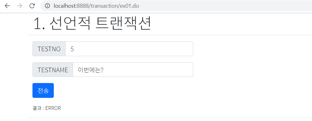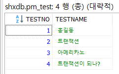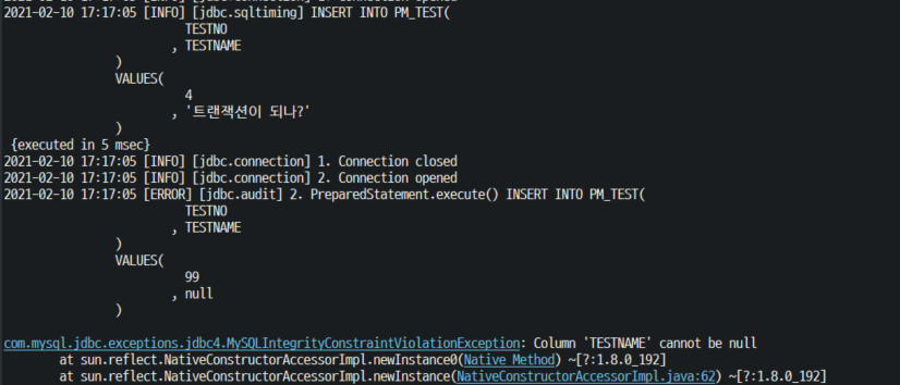 다시 테스트를 해보면 에러가 발생되어 롤백처리 된 것을 확인할 수 있다.