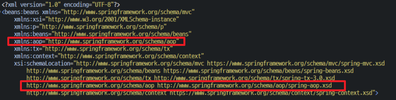 servlet-context-.xml에서 beans xmlns에 aop 항목을 추가하고 schemaLocation을 등록한다.