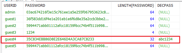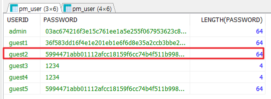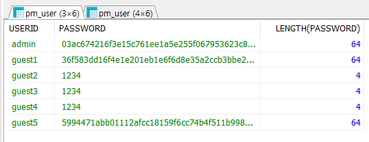 현재 데이터로 들어있는 값을 보면 guest2,3,4는 암호화되어 있지 않습니다.