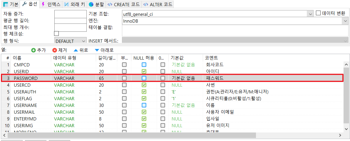 암호화를 적용한 테이블은 다음과 같습니다.