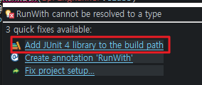 @RunWith 에러시에는 JUnit을 build path에 추가해주면 됩니다.