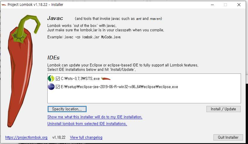 Specify location 클릭 후 lombok을 설치할 IDE를 선택합니다. Install/Update를 하면 설치가 완료됩니다.