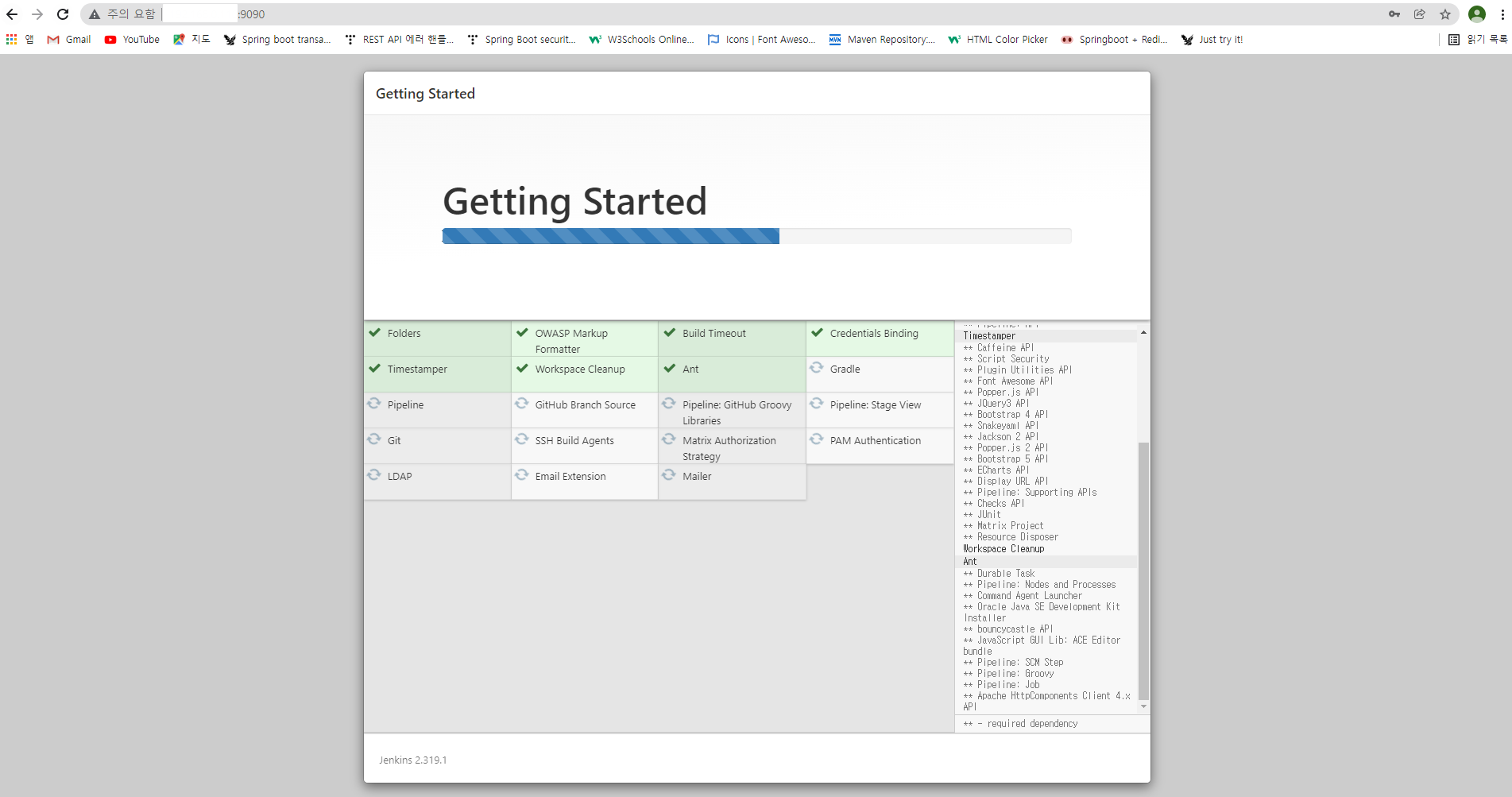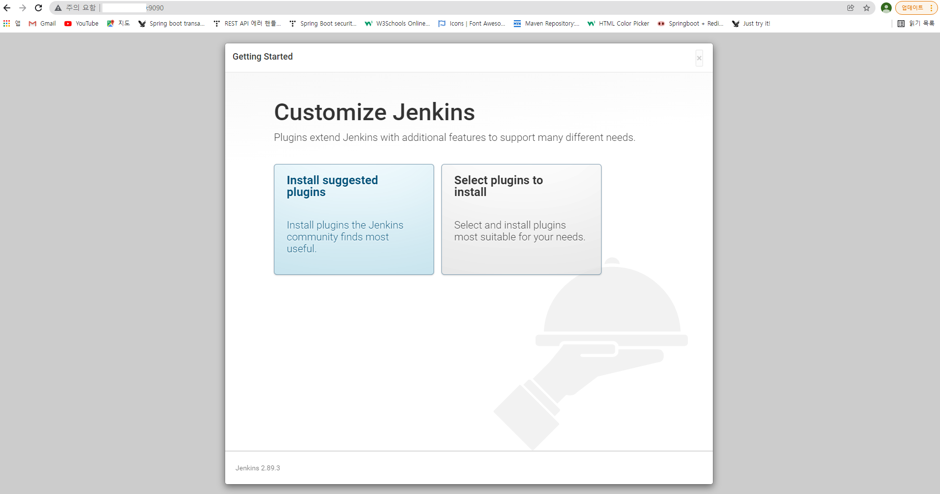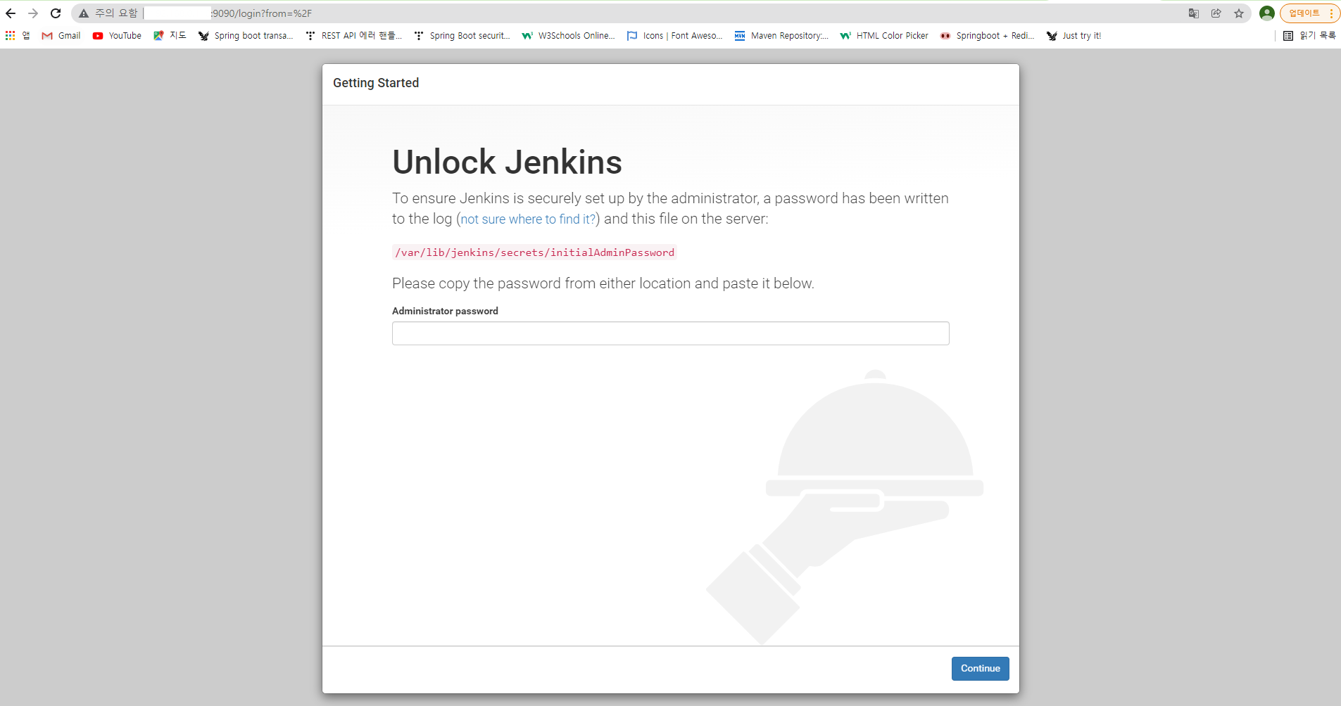 이제 젠킨스가 설치된 서버의 IP 또는 localhost:9090을 입력해보면 젠킨스 접속이 가능해진다.