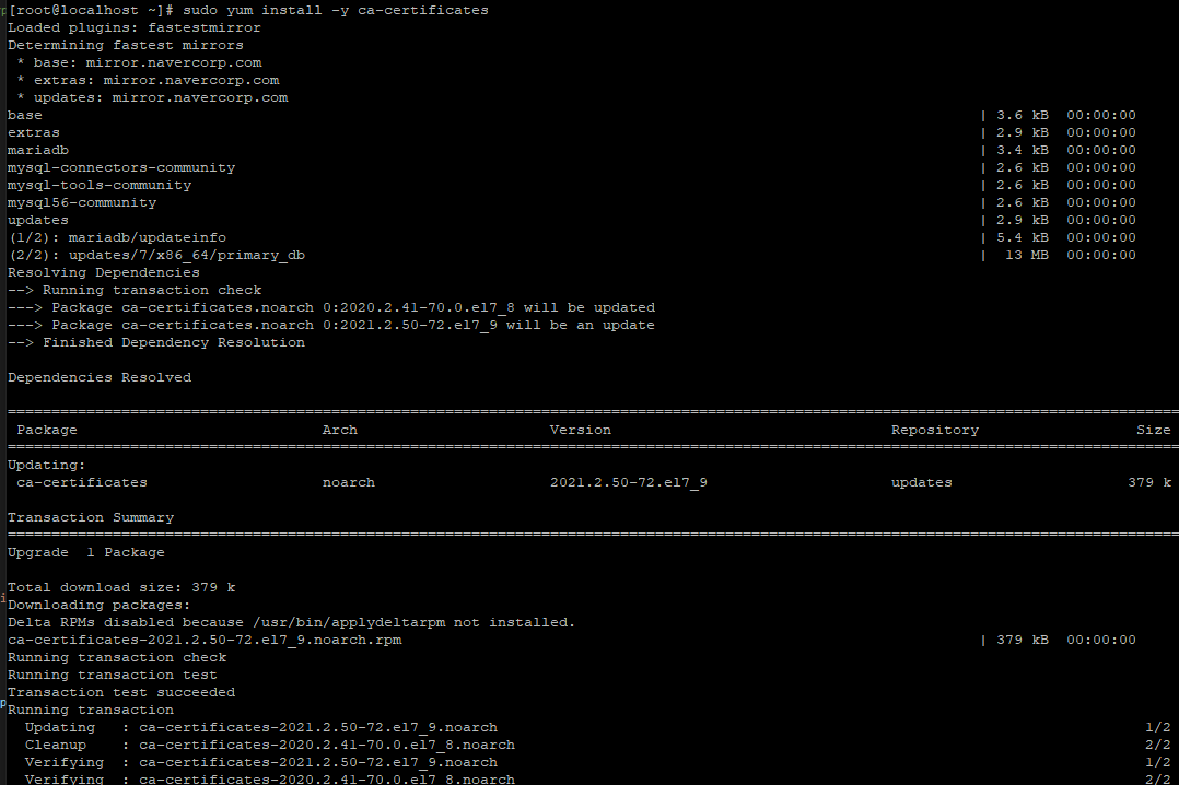 저장소 추가시 아래와 같은 에러가 났으나 sudo yum install -y ca-certificates 명령어로 해결할 수 있었다.