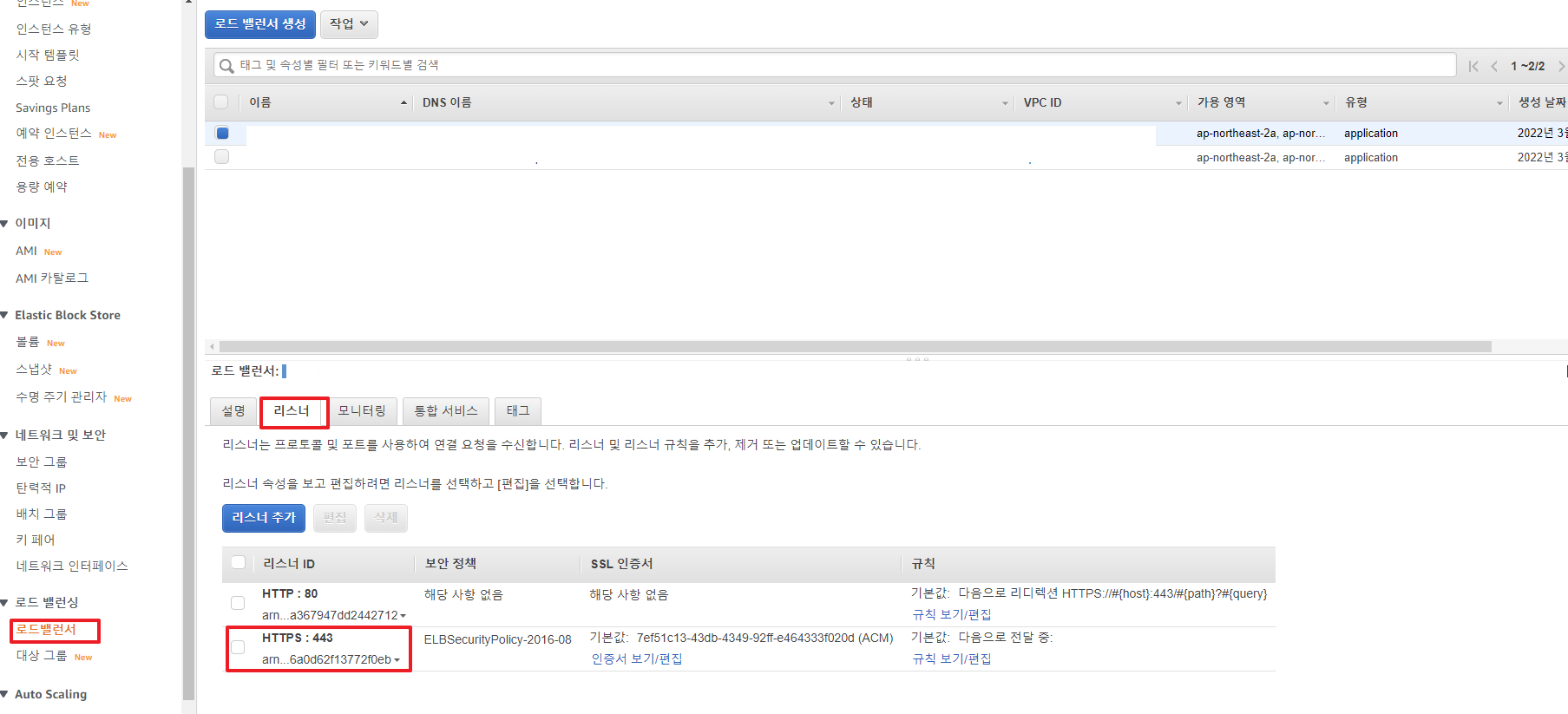 1) 로드 밸런싱 - 로드밸런서 클릭