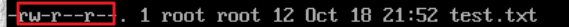 rw- r-- r-- : 파일 소유자는 test.txt 파일에 대한 읽기 쓰기 권한이 있고 그룹 사용자와 기타 사용자는 읽기만 가능하다.