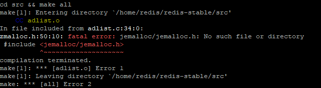 만약 make 명령어 실행시 아래와 같이 zmalloc.h:50:10: fatal error: jemalloc/jemalloc.h: No such file or directory 에러가 발생한다면 make 초기화를 통해 필요한 파일을 재설치 해야 합니다.