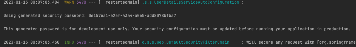 1. 프로젝트 셋팅까지 진행했을 때 서버를 실행해보면 아래와 같이 Security에서 기본적으로 제공해주는 화면이 보여진다. 각 정보는 아래와 같다. 로그인 이후에는 이동될 화면이 없기 때문에 화이트라벨 페이지가 보여지게 된다. 이 때 로그인 성공 후 보여질 화면을 추가해보자.