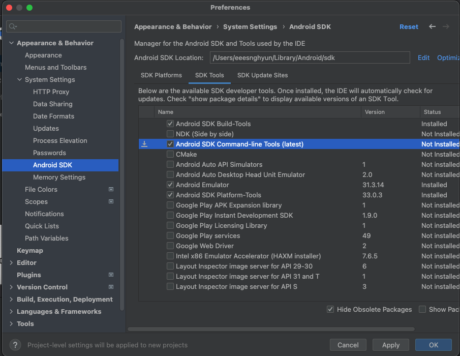 Android Studio - Preferences - Appearance & Behavior - System Settings - Android SDK - SDK Tools - Android SDK Command-line Tools (latest) 체크 후 apply