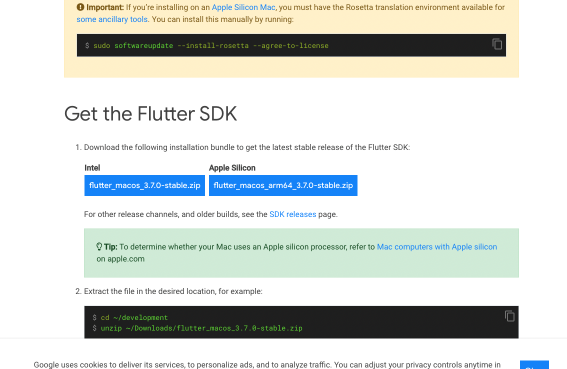 1-2. Get the Flutter SDK 아래에 있는 압축 파일을 다운로드 합니다.