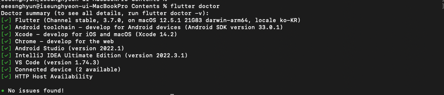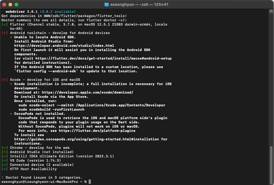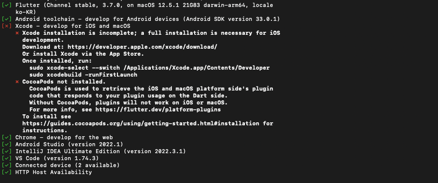 현재 Android Studio와 Xcode를 설치하지 않았기 때문에 두 Tool에 대한 에러를 확인할 수 있습니다.