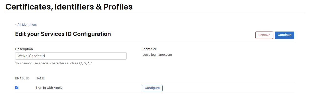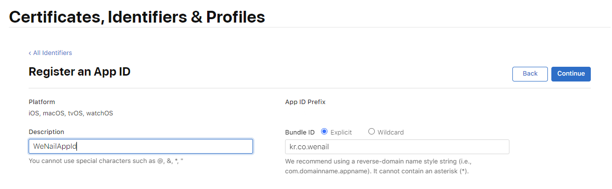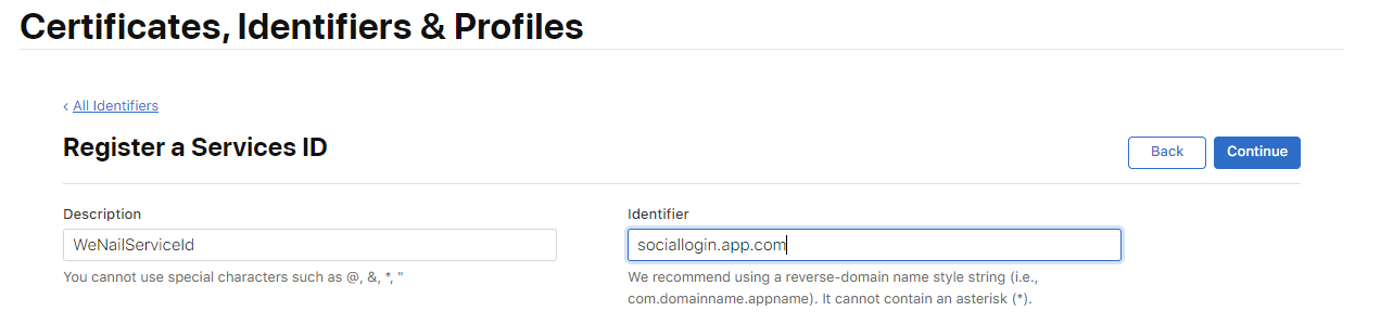 Services IDs 선택 후 Description & Identifier 를 입력해줍니다. 위와 동일하게 Description에는 Service ID를 설명할 수 있는 내용을 적으면 되고 Identifier는 패키지의 역순으로 작성합니다. 위에서 도메인의 역순을 작성했다면 중복 입력이 불가하기 때문입니다.