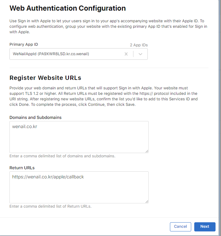 Domains and Subdomains : https 프로토콜을 사용하는 도메인을 입력해야합니다. localhost는 등록되지 않습니다. https를 제외한 도메인을 입력하고 서브 도메인을 사용하는 경우 추가로 입력이 가능합니다.