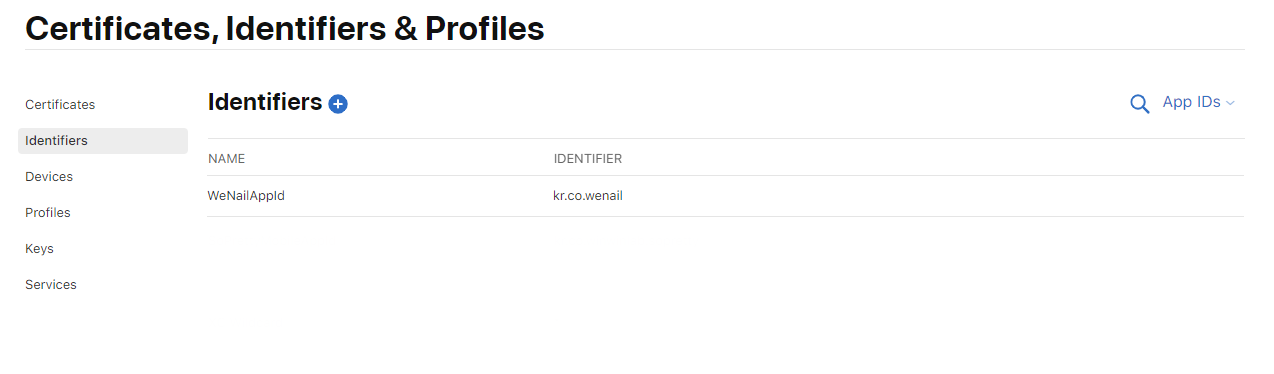 애플로그인을 하기 위해서는 AppId, Key, Service ID를 생성해야합니다. 식별자(영문)에서 먼저 AppId를 만들어보겠습니다.