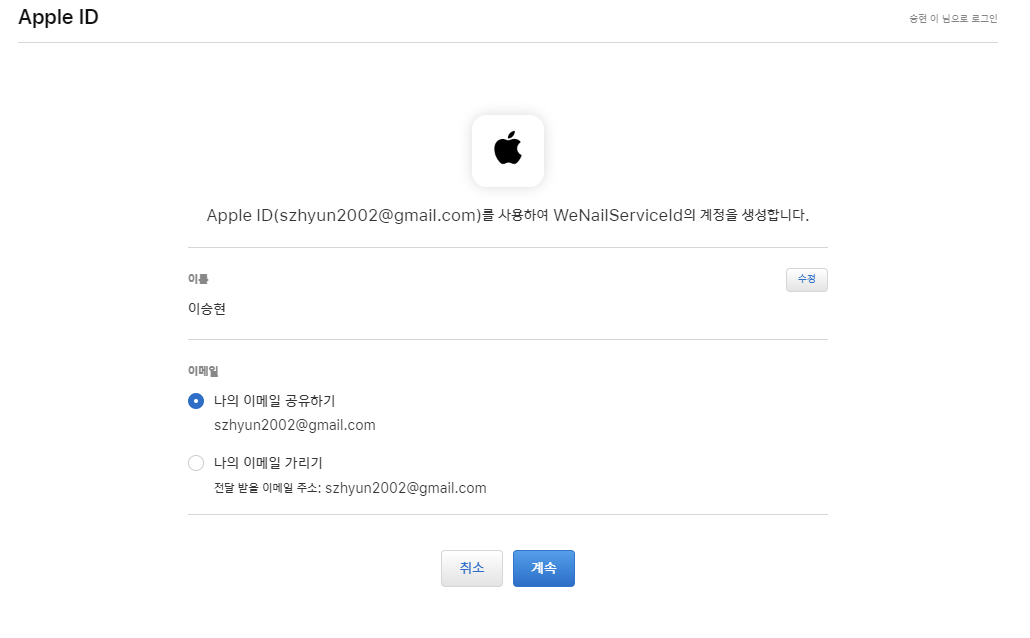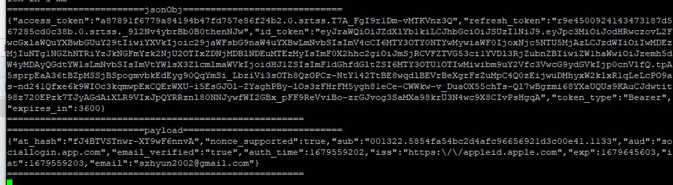 애플 로그인은 위에 설정을 해보면 알 수 있듯 다른 소셜 로그인에 비해 구현이 복잡한 편입니다. 이 예제에서는 email, sub(고유 식별 번호) 만을 추출해서 사용하게 됩니다.