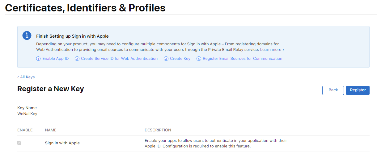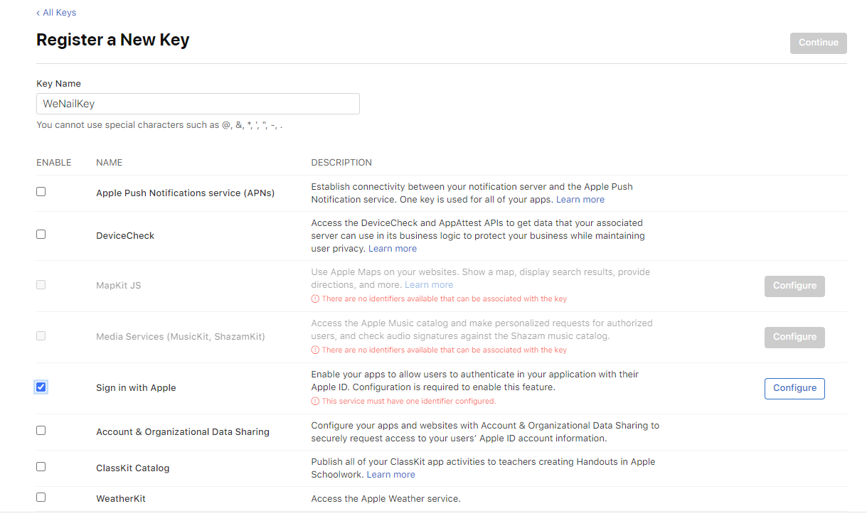 5-2) 키 이름 입력과 Sign in with Apple을 선택해줍니다.