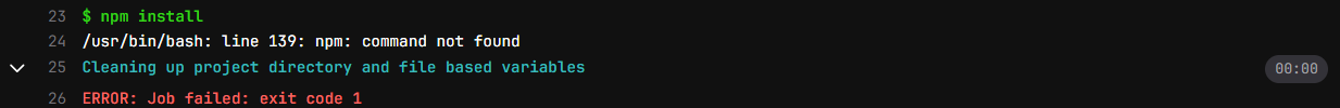 빌드 단계에서 아래와 같은 에러가 발생한다면 원격 서버에 접속해 /usr/local 디렉토리로 Node.js를 복사해 npm 명령어를 실행할 수 있게 합니다.