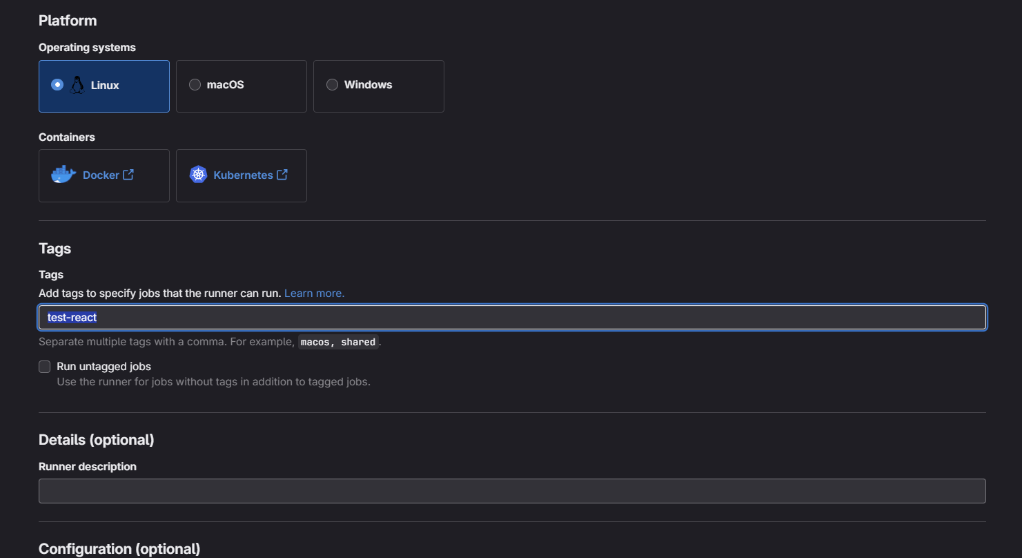 Tags 에 입력된 값을 통해 파이프라인에 정의된 Tag와 매핑되어 실행되어집니다. test-react 라고 입력합니다.
