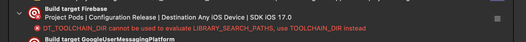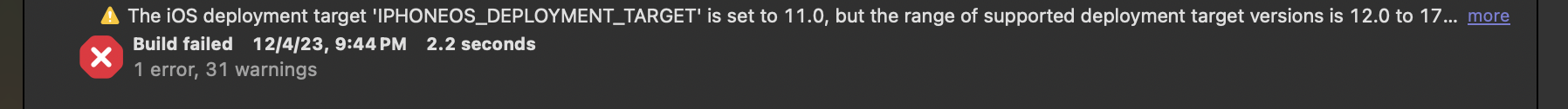 Framework/Flutter [Error]DT_TOOLCHAIN_DIR cannot be used to evaluate LIBRARY_SEARCH_PATHS, use TOOLCHAIN_DIR instead - 반응형 최근 iOS 버전을 업데이트(17) 하면서 Xcode 버전도 14에서 15로 업데이트를 하게 됐는데요. 역시나 빌드 과정에서 오류를 만났습니다. The iOS deployment target 'IPHONEOS_DEPLOYMENT_TARGET' is set to 11.0, but the range of supported deployment target versions is 12.0 to 17.0.99. 다행히 깃허브 이슈에 여러 글들이 올라와있어 문제를 쉽게 해결할 수 있었습니다. 1. cocoapod 업데이트 brew upgrade cocoapods 2. pod update cd ios rm -rf Podfile.lock pod install --repo-update 참고문서 When will there be a next release after 1.12.1? · Issue #12048 · CocoaPods/CocoaPods I'm really looking forward to the Xcode 15 fix. github.com 반응형 공유하기 게시글 관리 3인칭시점 저작자표시 비영리 변경금지 (새창열림) 'Framework > Flutter' 카테고리의 다른 글 [Flutter]iOS 앱 기본 언어 정보 한글로 변경하기 (0) 2024.05.20 [Error]"Uncaught TypeError: Cannot read property 'cancel' of undefined" (0) 2023.12.28 [Flutter]아이콘 변경하기 (0) 2023.11.16 [Error]onRequestPermissionsResult is called without results. This is probably caused by interfering request codes. (0) 2023.11.16 [Flutter]Admob 연동하기 (2) 2023.11.01 Contents 연관 포스팅 [Flutter]iOS 앱 기본 언어 정보 한글로 변경하기 2024. 5. 20. [Error]"Uncaught TypeError: Cannot read property 'cancel' of undefined" 2023. 12. 28. [Flutter]아이콘 변경하기 2023. 11. 16. [Error]onRequestPermissionsResult is called without results. This is probably caused by interfering request codes. 2023. 11. 16. 댓글 0 + 이전 댓글 더보기