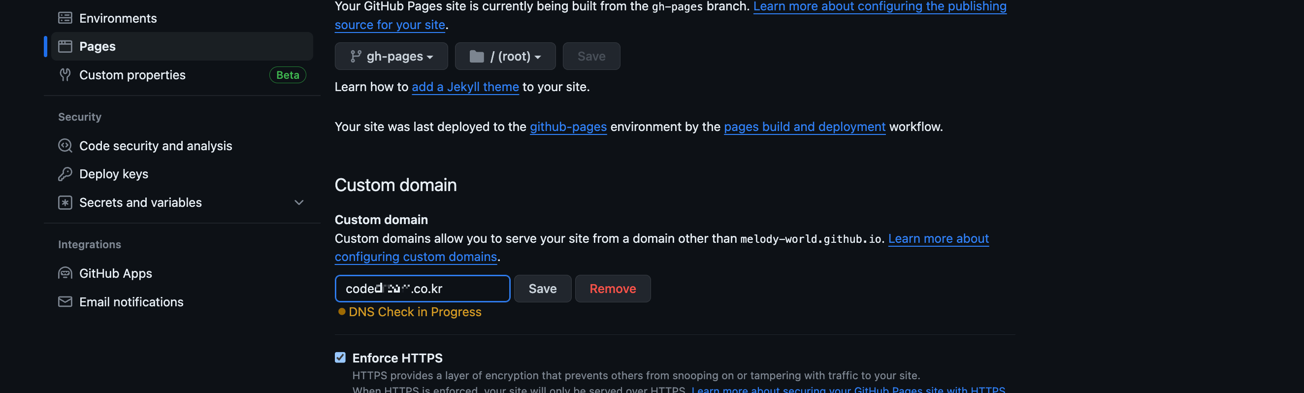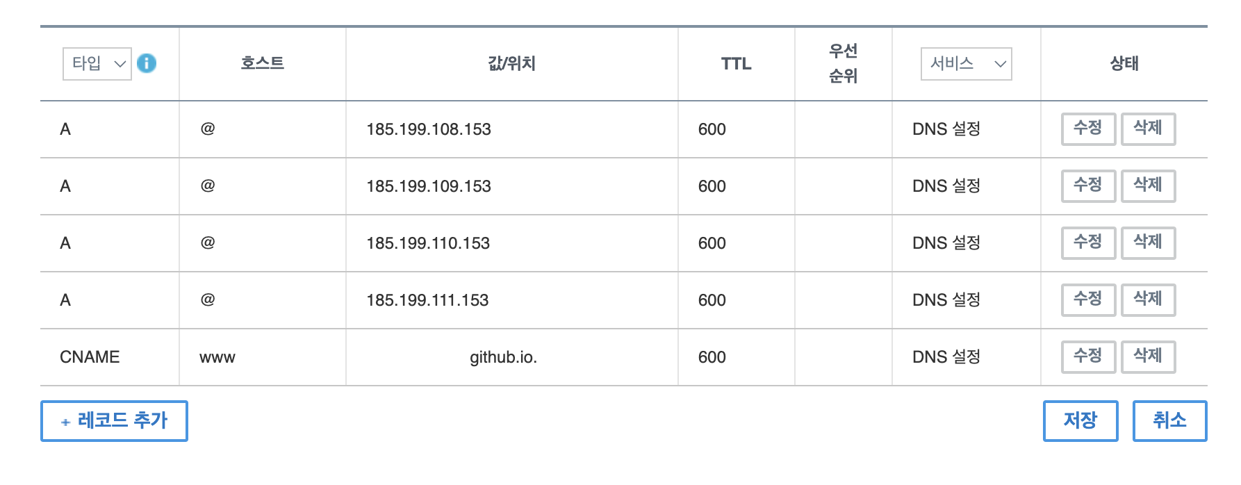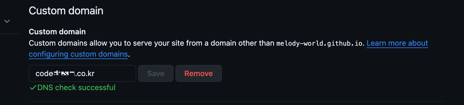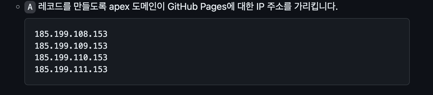 Setting GitHub Pages 가비아 도메인 연결하기 - 반응형 GitHub pages로 웹 호스팅을 사용하게 되면 레포지토리명.github.io로 사용하실 수 있습니다. 만약 특정 도메인을 연결하고 싶다면 몇가지 설정을 추가하면 됩니다. 본 포스팅에서는 가비아를 통해 도메인을 구입 후 해당 도메인을 연결하는 방법을 소개합니다. 1. 가비아 접속 로그인 후 My가비아를 클릭합니다. 2. DNS 관리툴 클릭 3. 설정 구매한 도메인이 리스트에 조회되고 설정을 클릭합니다. 4. GitHub Pages ip 입력 아래와 같이 레코드 추가 후 GitHub Pages의 IP 주소를 입력합니다. 5. GitHub - Repository - Settings 접속 Pages 탭, Custom domain 영역에 구매한 도메인을 입력합니다. 6. 도메인 연결 설정이 완료되고 시간이 조금 지나면 아래와 같이 DNS check successful이 보입니다. 참고문서 GitHub Pages 사이트의 사용자 지정 도메인 관리 - GitHub Docs GitHub Pages 사이트의 기본 도메인을 사용자 지정 도메인으로 가리키도록 특정 DNS 레코드 및 리포지토리 설정을 설정하거나 업데이트할 수 있습니다. GitHub Pages is available in public repositories with GitHub docs.github.com 반응형 공유하기 게시글 관리 3인칭시점 저작자표시 비영리 변경금지 (새창열림) 'Setting' 카테고리의 다른 글 [Cafe24]가상서버호스팅 DB 연결하기 (1) 2025.01.07 폐쇄망 Nexus 구축하기 (3) 2024.10.25 [Mac]Flutter 설치 (0) 2023.01.26 [Mac]JDK 설치 (0) 2023.01.14 [Mac]Git 설치 (0) 2023.01.13 Contents 연관 포스팅 [Cafe24]가상서버호스팅 DB 연결하기 2025. 1. 7. 폐쇄망 Nexus 구축하기 2024. 10. 25. [Mac]Flutter 설치 2023. 1. 26. [Mac]JDK 설치 2023. 1. 14. 댓글 2 + 이전 댓글 더보기