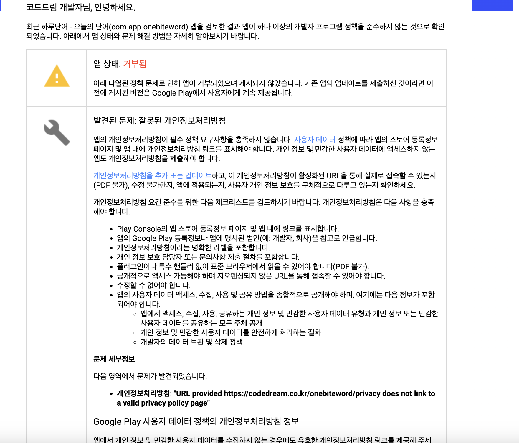 Google Rejected App due to "Privacy policy link invalid or missing"