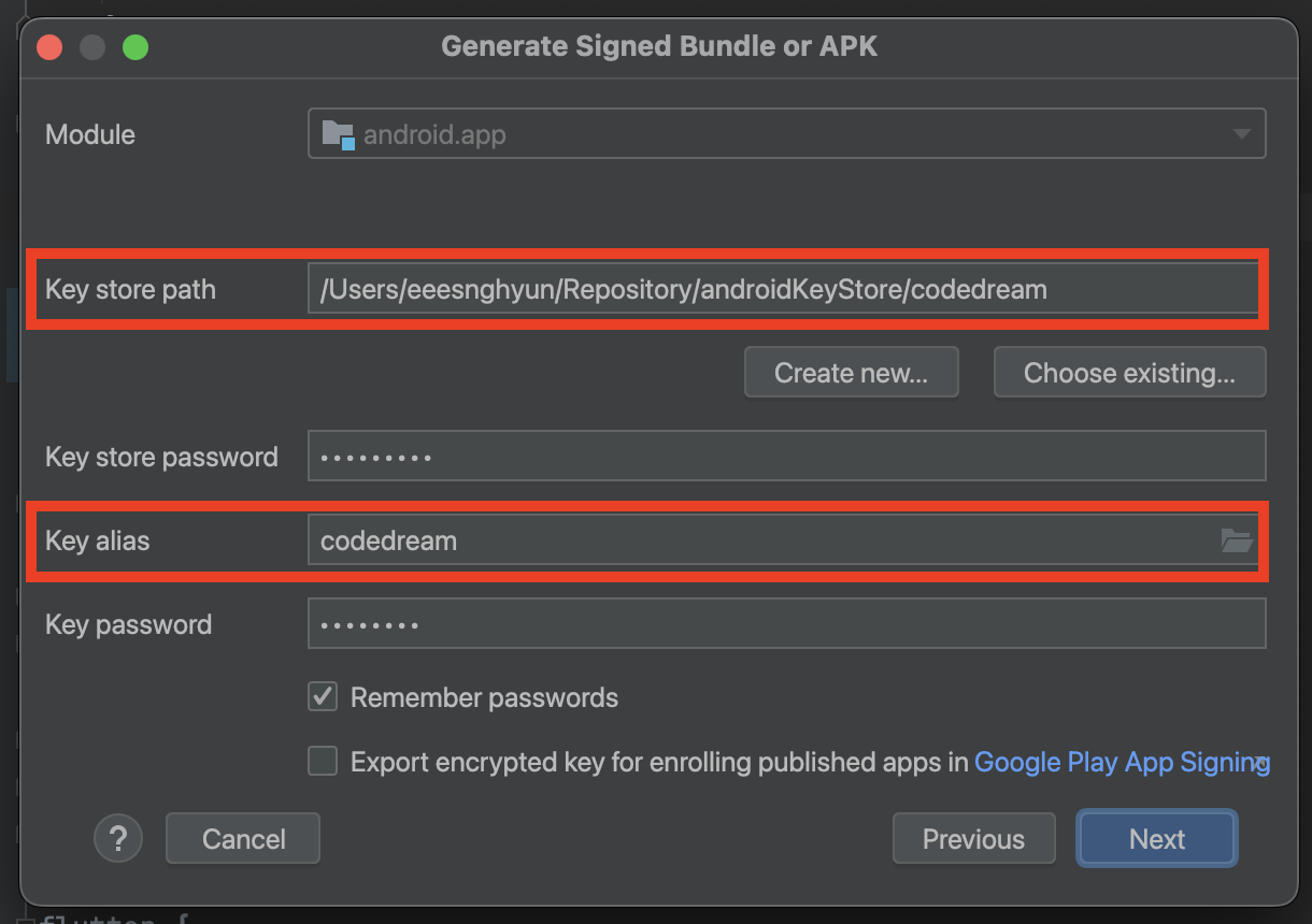 업로드 키의 경로는 아래에서 보이는 Key store path입니다.