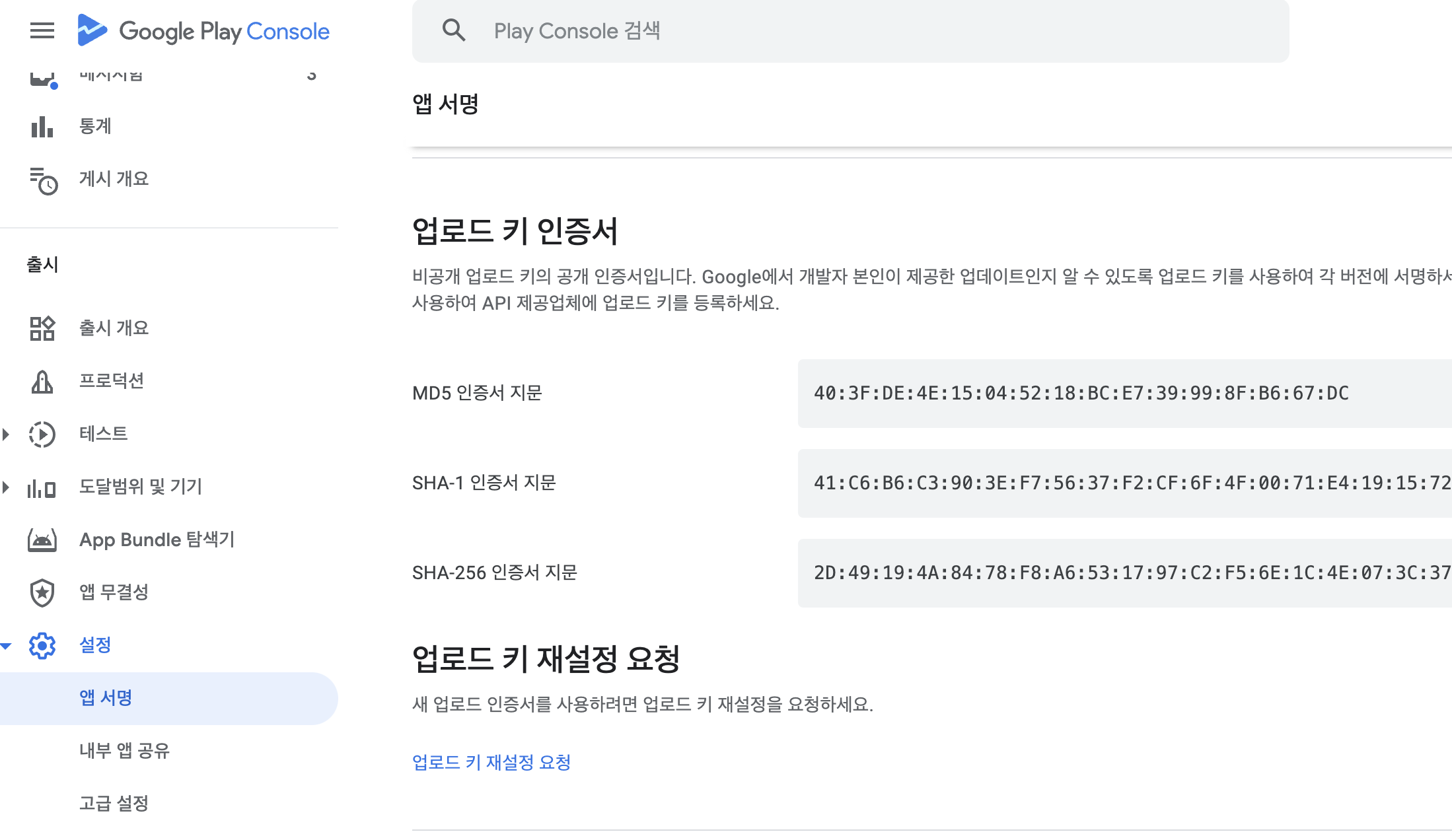 앱 - 설정 - 앱 서명에 접속 후 업로드 키 재설정 요청을 클릭합니다.