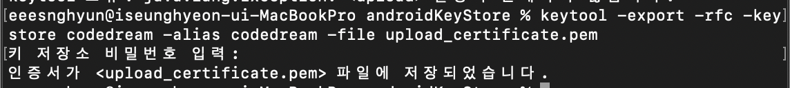 keytool -export -rfc -keystore [업로드키] -alias [키별칭] -file [생성될 pem 파일명]
