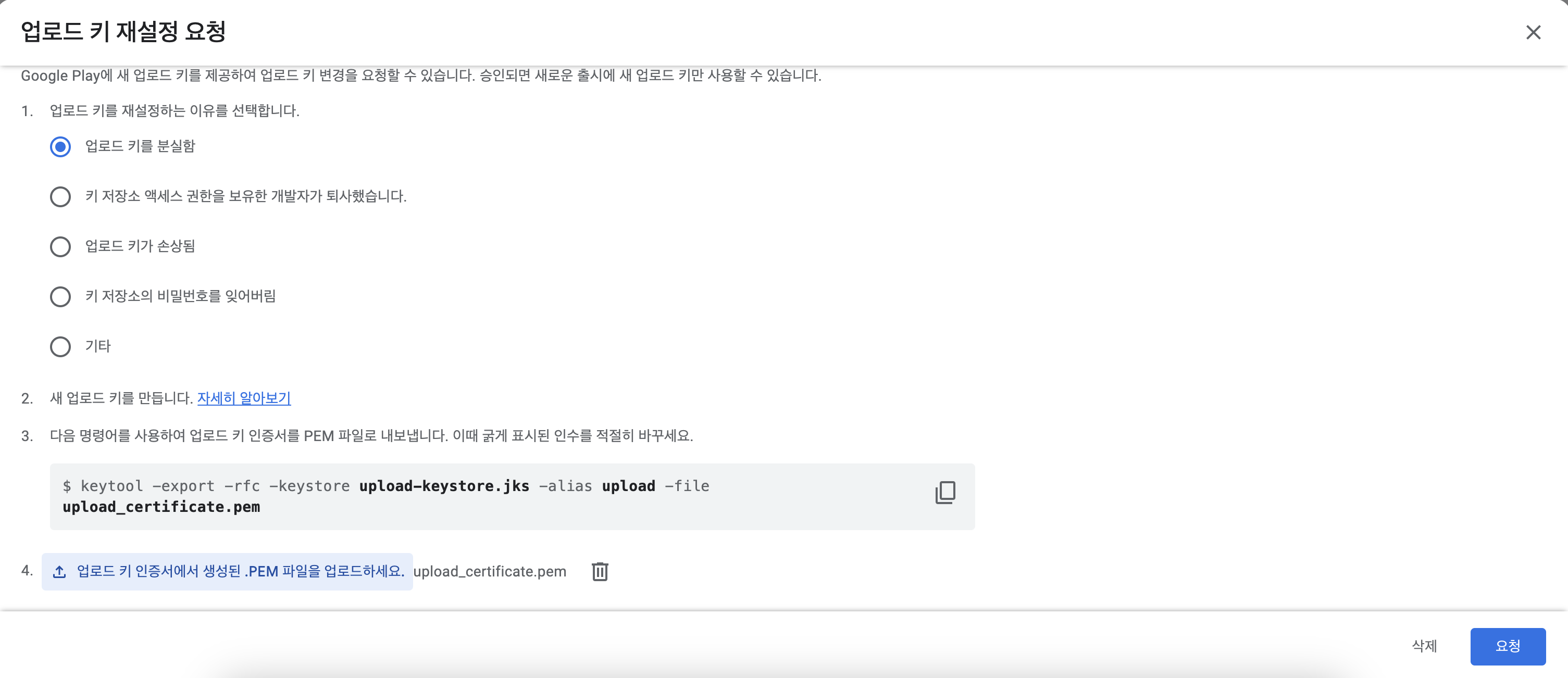 플레이스토어에 앱을 최초 배포 후에 업로드 키를 분실했습니다. 그리고 새로운 키를 만들고 배포를 시도했는데요.
